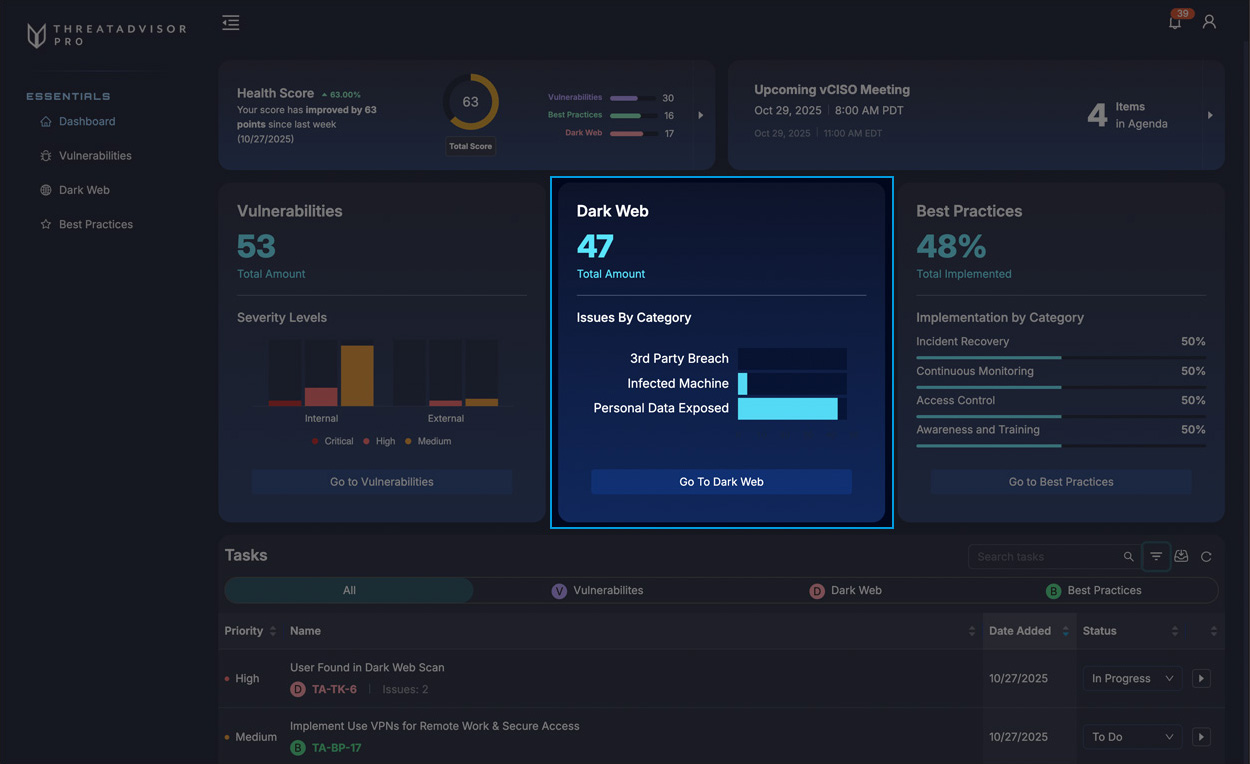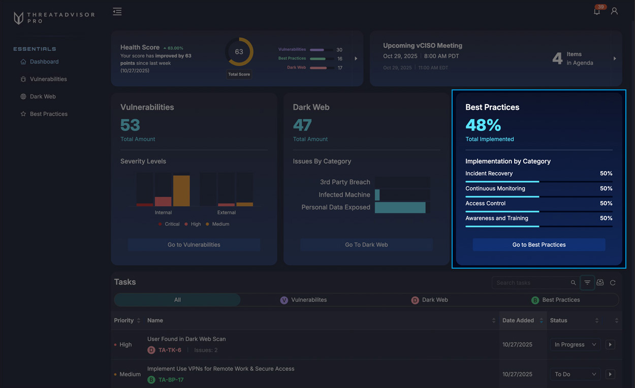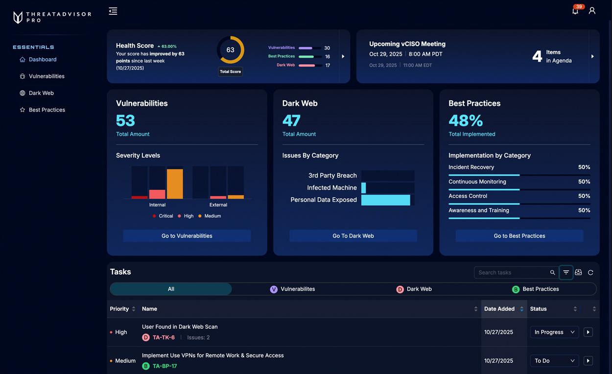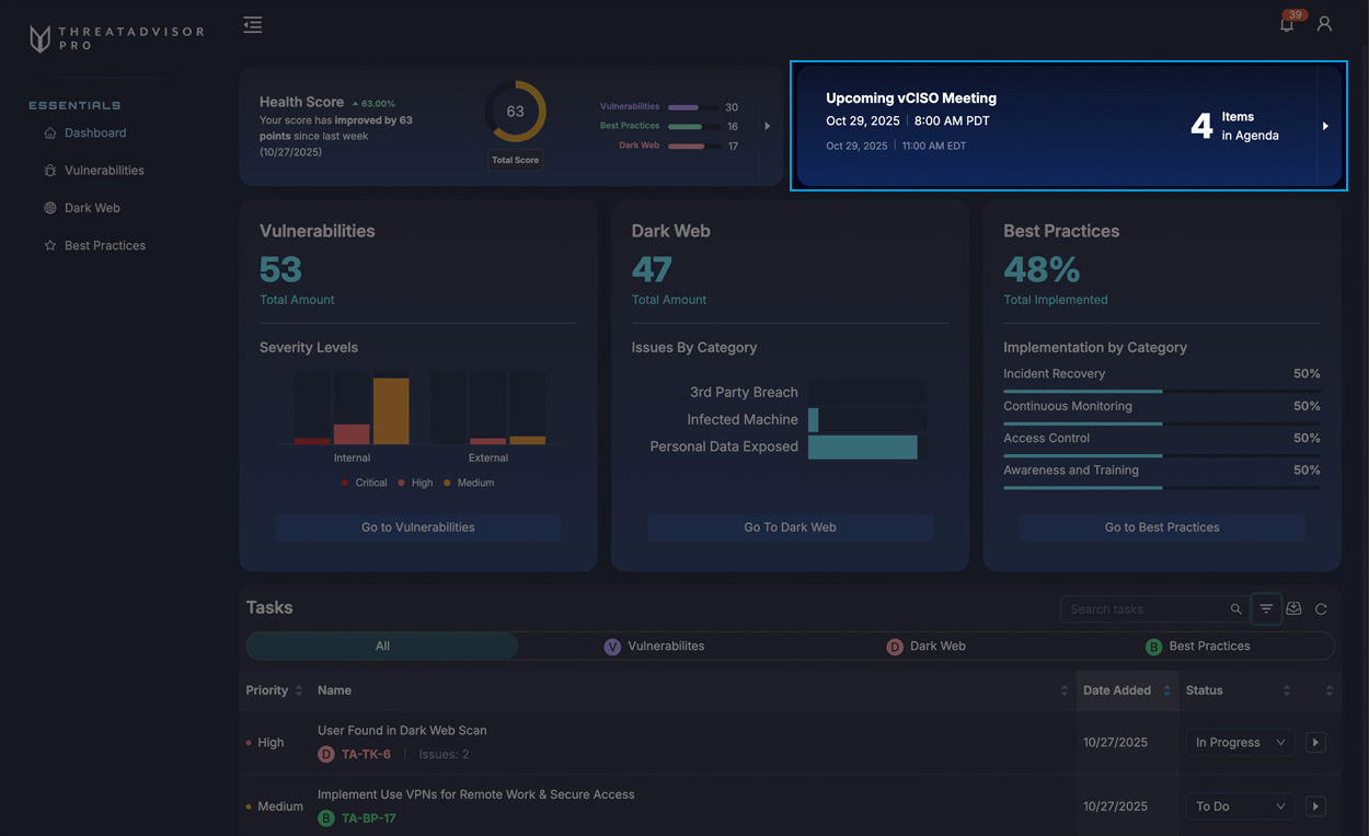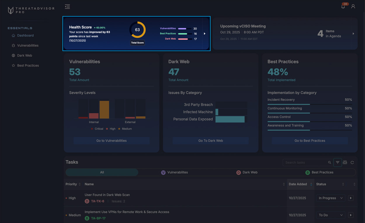 Consider this your command center to see your overall Health Score, view prioritized issues, and build your vCISO meeting agenda.